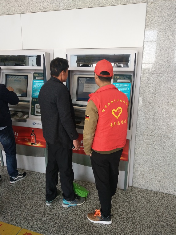 郑万军首先与蚌埠南站服务中心的工作人员进行了联系,工作人员给大家分配了各自的任务。志愿者们认真了解了各自的职责后,纷纷投入到了工作中。由于清明节假期蚌埠南站的人流量很大,志愿者们都非常主动热情的帮助大家解决困难,比如帮助带小孩的旅客提行李,引导旅客到相应站台候车等等。在这次志愿活动中让我们印象深刻的一件事就是一位老爷爷因为第一次独自操作自动售票机,他感到非常迷茫和无助,志愿者任文娟发现后及时耐心的帮助这位老爷爷,教他如何进行取票操作,使他顺利的踏上了旅途,老爷爷在离开时对我们说“今天真是幸亏遇到了你们,要不我真的不知道该怎么办了,谢谢你们”!志愿者们优秀的表现得到了高铁南站工作人员的表扬和旅客们的称赞,大家虽然觉得很辛苦但也非常开心,工作也变得更加热情了。