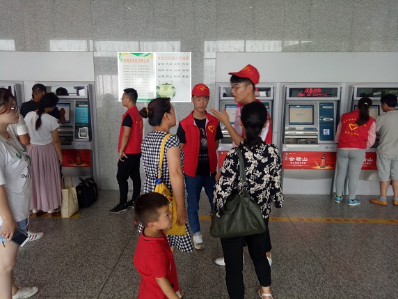 在高铁站时志愿者们发扬雷锋精神,秉承着“奉献 有爱 互助 进步”的宗旨,为旅客服务。有位乘客在自动售票机购买车票后准备付钱时机器突然出现了故障,我们的志愿者见状立刻去柜台告知了工作人员使机器及时得到了维修,并帮助该旅客成功买了高铁票。