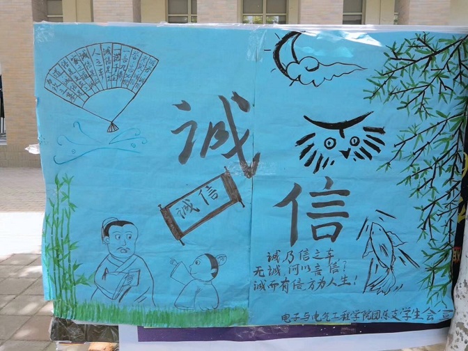 为了增强同学们的诚信意识,让诚信之花开得更香更广,由太阳成集团tyc7111团总支主办的诚信图片展宣传活动于2019年5月25日圆满结束。本次活动以展板和海报的形式向大家展示了一些诚信故事,告诉同学们诚信的意义和重要性。活动中同学们积极主动地学习和宣传了诚信知识,并表达了自己对诚信的理解,进一步了解了诚信的意义以及诚信在生活中的重要性。