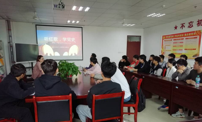 “没有共产党就没有新中国,没有共产党就没有新中国,共产党,辛劳为民族,共产党他一心救中国……”,会议首先以经典红歌《没有共产党就没有新中国》作为开场,表明了中国共产党的创建,是中华民族发展史上开天辟地的大事变,具有伟大而深远的意义。随后,刘斯文为支部党员先后播放了党的浴血奋战,实现民族独立;艰难探索,社会主义建设在曲折中前进;改革开放,走上中国特色社会主义新道路;新时代新征程,为全面建成小康社会而奋斗等四个不同的历史进程中的《南湖的船党的摇篮》、《歌唱祖国》、《在希望的田野上》、《我爱你,中国》等22首红歌,带领全体党员在经典红歌中回溯百年党史,以音乐展现祖国的不平凡历程。