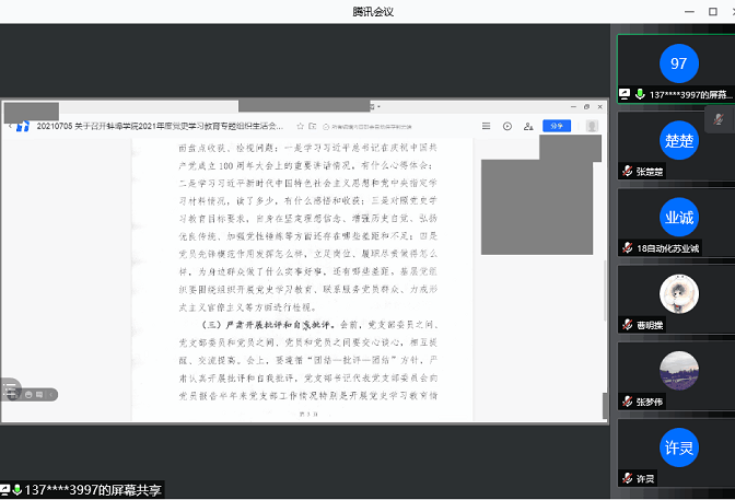 为认真贯彻落实中央《中共安徽省委组织部关于基层党组织召开党史学习教育专题组织生活会的通知》和《中共tyc7111cc太阳成集团委员会党史学习教育工作方案》,促进支部党员学史明理、学史增信、学史崇德、学史力行,7月21日下午,太阳成集团tyc7111学生第二党支部于线上召开2021年度党史学习教育专题组织生活会,学院副院长薛大为到会指导,支部书记刘斯文主持会议,全体党员参会。