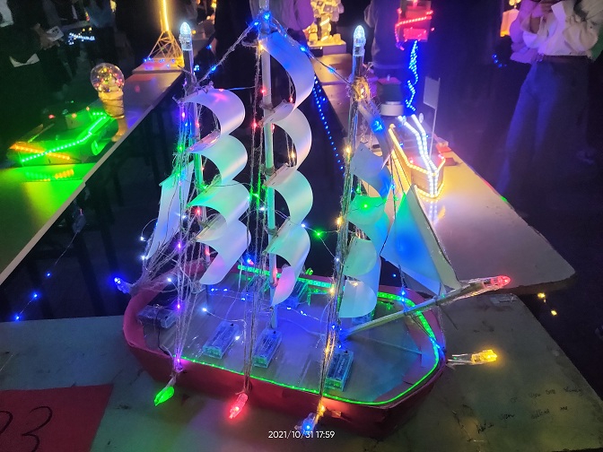 比赛评委由现场近500名学生观众和3位专业老师组成,共评出25件优秀作品,其中《天安门》荣获创意组一等奖,《广州塔》荣获电控组一等奖,《许愿的星云》、《扬帆起航》、《天眼》和《繁花似锦》荣获创意组人气奖,《无限光立圈》荣获电控组人气奖,《启航号》、《航天兴国》、《莲叶何田田》和《埃菲尔铁塔》荣获创意组创意奖,《心形流水灯》荣获电控组创意奖。
