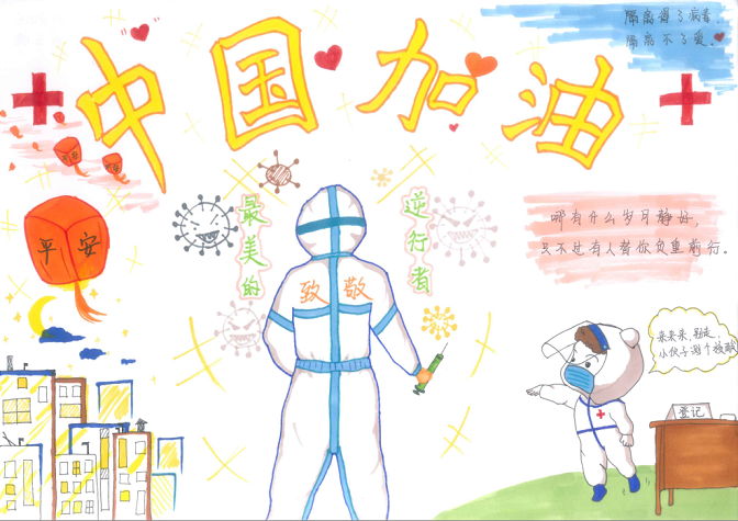 绘画比赛历时两个小时,同学们用简约的线条、多变的色彩创作出一幅幅饱含情感的绘画作品:有义无反顾,逆风而行的“白衣天使”;有最美逆行者恪尽职守的真实写照;有对防疫步骤的知识宣讲等等,他们用生花妙笔表达了在疫情期间的真实感受,再现了抗疫期间那一幕幕感人至深的画面。以画传情,讴歌抗“疫”英雄,礼赞抗“疫”事迹。