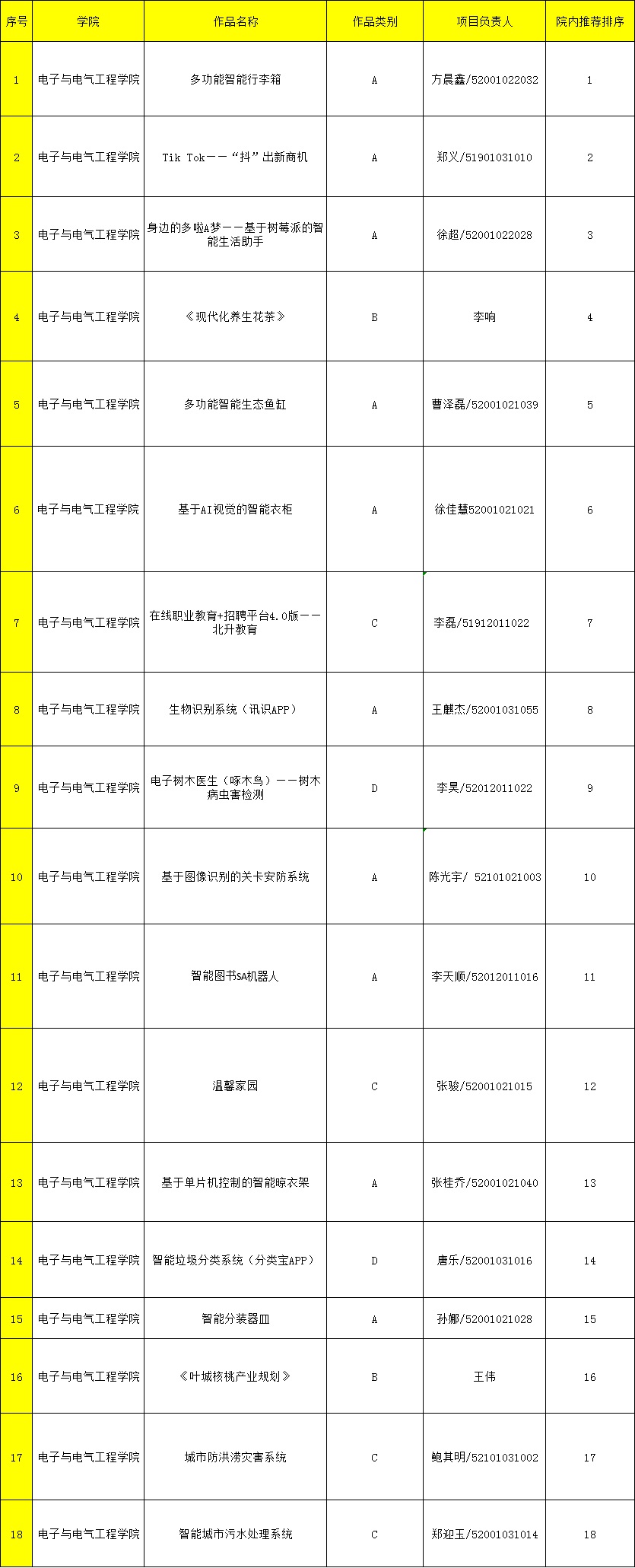 太阳成集团tyc7111于作品提交期内共收到18件作品,根据《tyc7111cc太阳成集团2022年“挑战杯”中国大学生创业计划竞赛校内选拔赛方案》,学院组织了院内选拔评审,对这18件作品的排序如下: