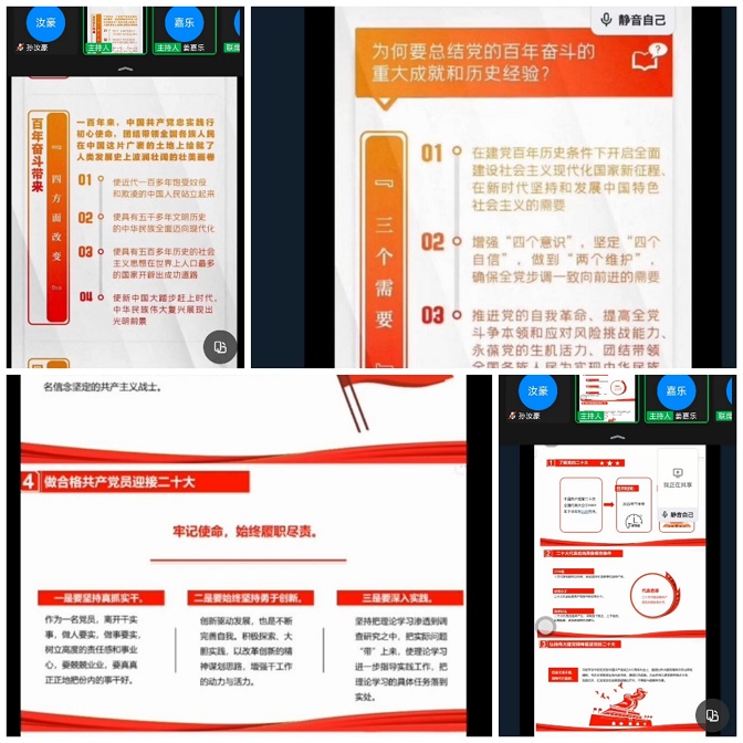 全体学生党员还深入学习贯彻了党的十九届六中全会精神。学习讨论中,大家纷纷表示,将深入学习领会全会精神,不忘初心、砥砺奋进,以榜样为标杆、传承榜样精神,以更高的要求鞭策自己,提高自身能力,不断充实自我,充分发挥党员先锋模范作用,主动承担历史赋予当代青年的责任,在学习创新中不断取得新的更大的成绩,为实现新时代中国梦奉献出力所能及的力量,以优异成绩迎接党的二十大召开。会后,学生党员张梦伟说:“回望党的发展历程和伟大成就,每一位党员要在新的征程中凝心聚力、奋发有为,做出更大的新的贡献。”