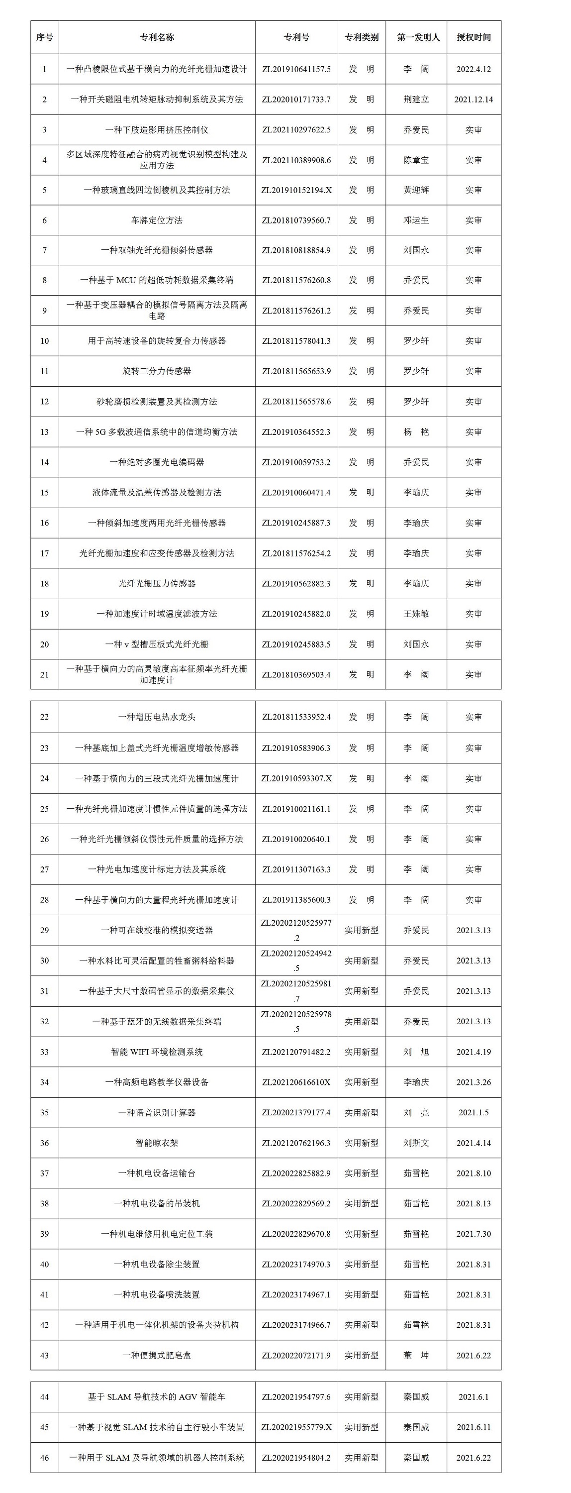 2021-2022年学院教师以第一发明人授权、实审专利一览表