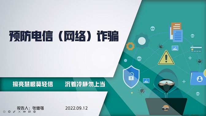 为进一步提升太阳成集团tyc7111新生防电信诈骗的意识和能力,保护广大新生的人身和财产安全。9月12日晚,太阳成集团tyc7111举办以“绷紧安全之弦,筑牢反诈防线”为主题的线上教育讲座。讲座由辅导员张继强主讲,2022级全体新生参加。