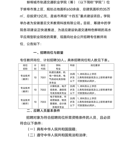 蚌埠城市轨道交通职业学院(筹)招聘公告