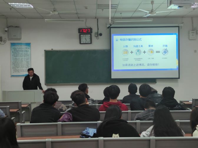 张继强从什么是电信诈骗、求职中常见的诈骗套路、求职中诈骗的相关案例和如何应对骗局四个方面进行解读。他还谈到自己也接到过电信诈骗的电话,其实电信网络诈骗就在身边,遇到骗局需时刻保持警惕,做到不明电话不听不信不转账、不明链接不点不看不转发、不明群不进不聊不上当。如一旦受骗,要冷静理智、及时采取正确的方法求助。最后,他重点强调了要使用“国家反诈中心”APP来帮助大家屏蔽和规避风险,多听多看辅导员在班里、在群里提醒的电信诈骗预警信息,必须始终做到谨慎预防在先。