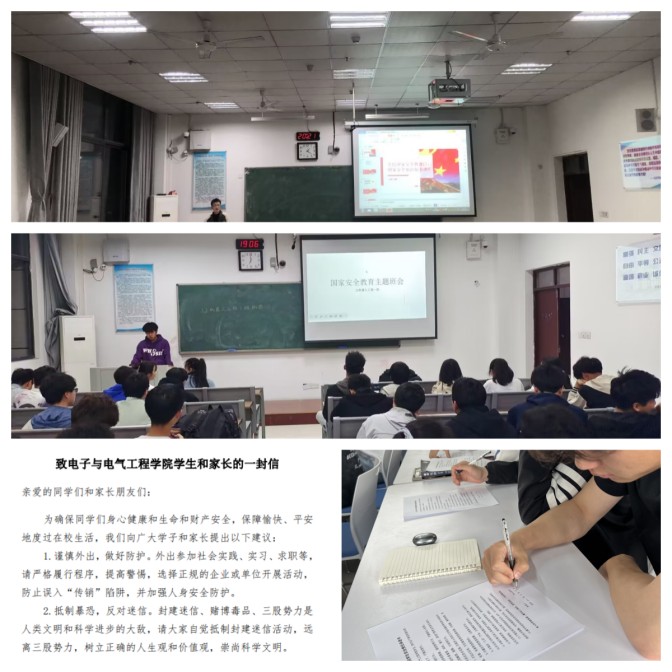 各班级组织召开形式多样的安全教育主题班会,观看“千万师生同上一堂国家安全教育课”,解读总体国家安全观,了解国家安全的重要性;辅导员结合案例,围绕“培训贷”网络诈骗、抵制邪教、心理健康安全、宿舍安全、溺水安全、交通安全等方面,分析讲解各类校园安全知识;各班级学习贯彻《安徽省学校安全条例》工作方案,加强学生防范和应对风险的意识和能力;加强安全教育意识提醒,向学生和家长发出《致太阳成集团tyc7111学生和家长的一封信》,与学生签订《太阳成集团tyc7111学生安全责任承诺书》。