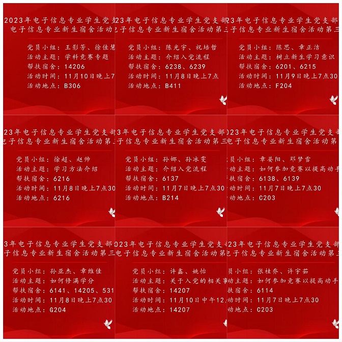 为进一步了解2023级新生的学习生活状况,帮助新生更好地适应大学生活,电子信息专业学生党支部于2023年11月7-10日开展第三期学生党员结对新生宿舍活动。