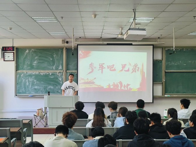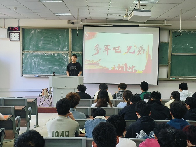 班会第二阶段征兵宣讲同样吸引了同学们的广泛关注。首先李芹影为同学们放映了相关征兵宣传视频,并通过PPT宣讲的方式为在座同学详细介绍了国家对于大学生参军的优惠政策。接着,来自2022级电气1班退伍军人陶和旺同学结合自己参军经历,分享了自己军旅生活的点点滴滴和对军人身份的自豪之情。退伍军人陈榆同学则从国防和军队建设的角度出发,鼓励同学们积极响应祖国号召,投身军营,为国家安全贡献力量。他们的发言言简意赅,深入浅出,从个人,家庭,国家等多个角度算了“成本账”、“经济账”、“政治账”,不仅传递了对国防事业的忠诚,也展示了当代青年应有的责任与担当。