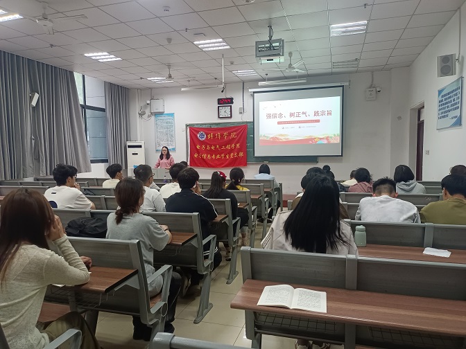 为深入开展学习贯彻习近平新时代中国特色社会主义思想主题教育,2024年5月11日中午,电子信息专业学生党支部书记刘斯文在G103为全体支部党员讲授以《强信念 树正气 践宗旨》为主题的党课。
