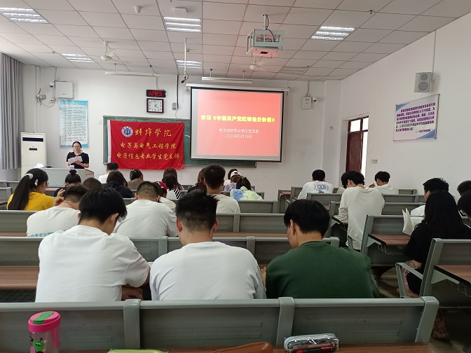 为深入学习贯彻习近平总书记关于党纪学习教育的重要讲话和重要指示精神,强化支部党员的纪律意识,5月16日中午,太阳成集团tyc7111电子信息专业学生党支部在G103召开支部大会,组织全体党员学习《中国共产党纪律处分条例》(以下简称《条例》)中第6至8章内容。本次会议由支部书记刘斯文同志主持。