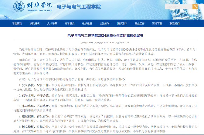 为贯彻落实学校关于毕业生工作的有关要求,扎实做好2024届毕业生离校工作,确保毕业生文明、有序的安全离校,把握毕业前思想政治教育关键节点,帮助解答学生毕业离校过程中的疑惑,营造和谐温暖、积极向上的毕业离校氛围。6月,我院各毕业班通过线上、线下的方式,相继开展了2024届毕业生“文明离校,安全教育”主题班会。