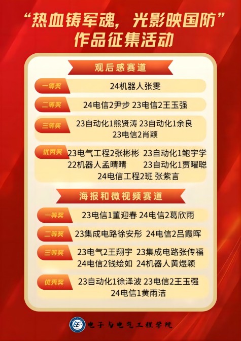 本次征集活动分电影观后感赛道和海报微视频赛道。在电影观后感赛道中,共有10位参赛者参与;而在海报微视频赛道,则有25位参赛者加入角逐。经过评委们的严格评审,各类优秀作品脱颖而出。在观后感赛道中,参赛者们用真挚的笔触抒发对国防和军人精神的深刻感悟。其中,2024级机器人工程班的张雯同学以细腻的情感描绘和深入的思考,展现出对军魂内涵的深刻理解,荣获一等奖。海报微视频赛道同样精彩纷呈:2023级电子信息工程1班董迎春同学、24级电子信息工程2班葛欣雨同学创作的海报,凭借其独特的色彩运用及精妙的形象设计,成功凸显了将军魂与国防的核心主题,从而在众多参赛作品中显著突显,荣获一等奖。