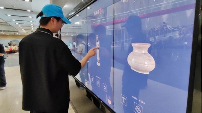 指尖穿越七千年,光影再现淮畔烟云。 在蚌埠博物馆一楼流光溢彩的临时展厅内,一座汇聚数字智慧的展台成为连接古今的奇妙枢纽。这里,不再是冰冷的“禁止触摸”,而是鼓励实践队员们伸出手指,直接感触土层中沉睡千年的文物遗痕,细致摩挲那些承载着远古信息的陶器碎片。借助尖端技术全方位储存的文物细节、专家详尽的模型演示与场景还原,双墩先民制陶、耕猎的生活图景如画卷般在青年学子眼前铺陈开来。这前所未有的沉浸式体验,让尘封的历史瞬间变得可触可感。