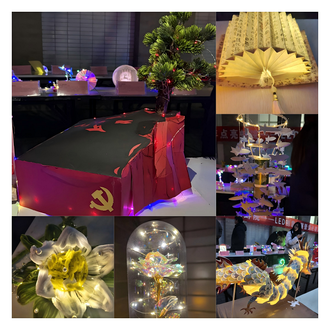 LED灯展在图书馆后广场展开,现场陈列着参赛选手精心设计的灯展作品。这些灯光造型巧妙融合红色元素与专业特色,或用灯带勾勒山河壮阔轮廓,或用灯组点亮时代发展符号,夜色中交织成一片璀璨的光影世界。灯展现场由学院组织部等部门组织志愿者,有序引导师生参观,大家纷纷驻足观赏、拍照打卡,在光影艺术中触摸时代发展的轨迹。